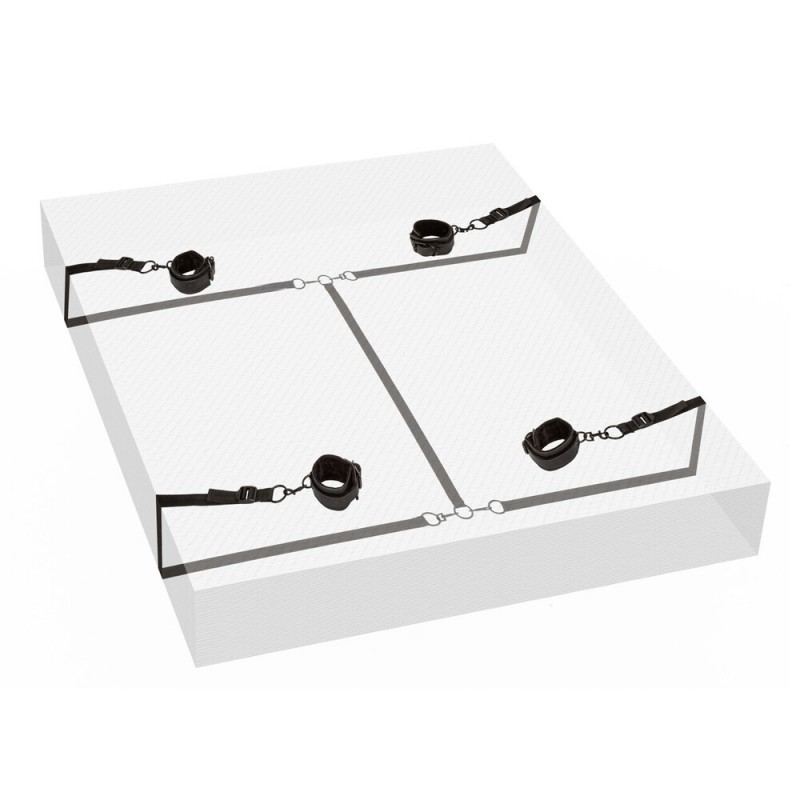 4 totally adjustable and detachable wrist or ankle cuffs. 4 sturdy, adjustable tethers to fit most mattresses. May be used under any bed or as individual tethers. Universal clasps and O-rings with swivel design for full dexterity. Soft and plushy interior with a vegan leather exterior. Double padded, double-stitched. Functional, durable and textured design.